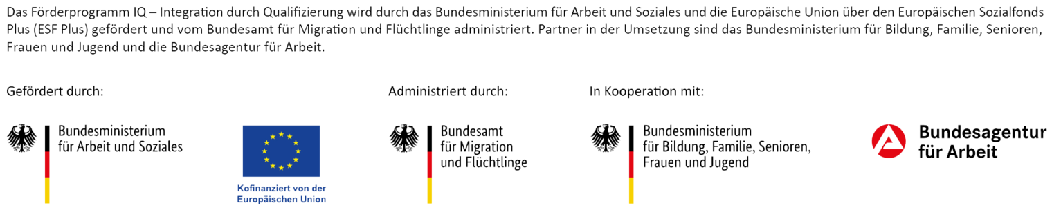 Das Projekt IQ Handwerk Rheinland-Pfalz wird im Rahmen des Förderprogramms „IQ - Integration durch Qualifizierung“ durch das Bundesministerium für Arbeit und Soziales und die Europäische Union über den Europäischen Sozialfonds Plus (ESF Plus) gefördert und vom Bundesamt für Migration und Flüchtlinge administriert. Partner in der Umsetzung sind das Bundesministerium für Bildung, Familie, Senioren, Frauen und Jugend und die Bundesagentur für Arbeit.